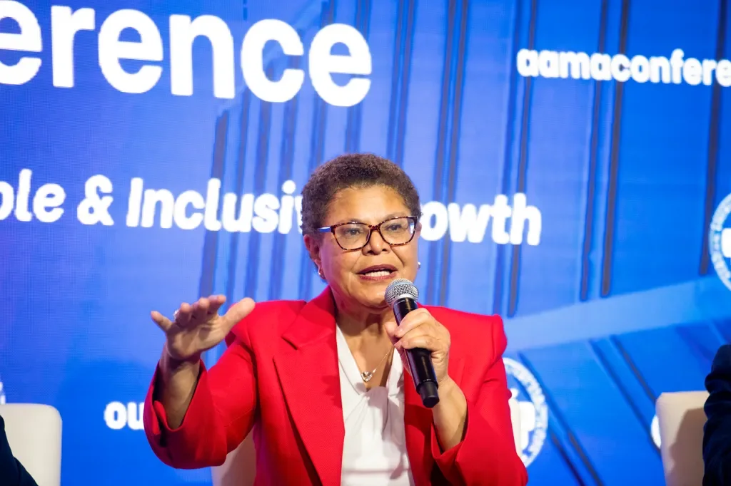 Los Angeles Mayor Karen Bass speaks during the ninth Annual Conference of the African American Mayors Association at the Omni Shoreham Hotel in Washington D.C., on April 21, 2023. Photo by Rod Lamkey, CNP/Sipa USA via Reuters